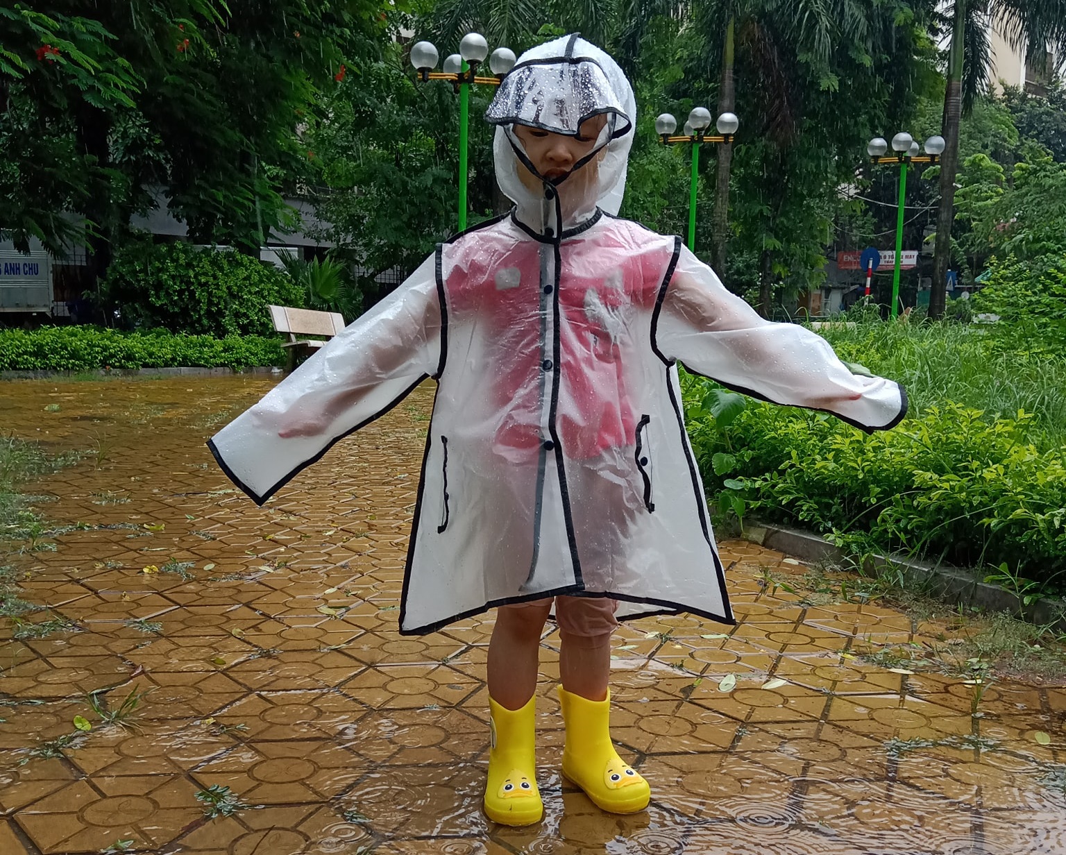 Trang bị áo mưa,ủng cho trẻ mỗi khi ra ngoài trời mưa để bảo vệ sức khỏe của bé. Ảnh: Hải Âu