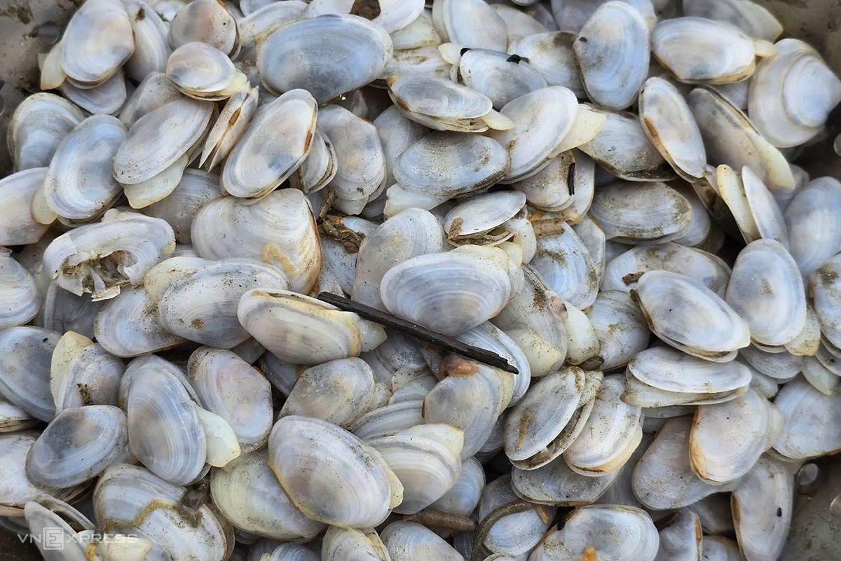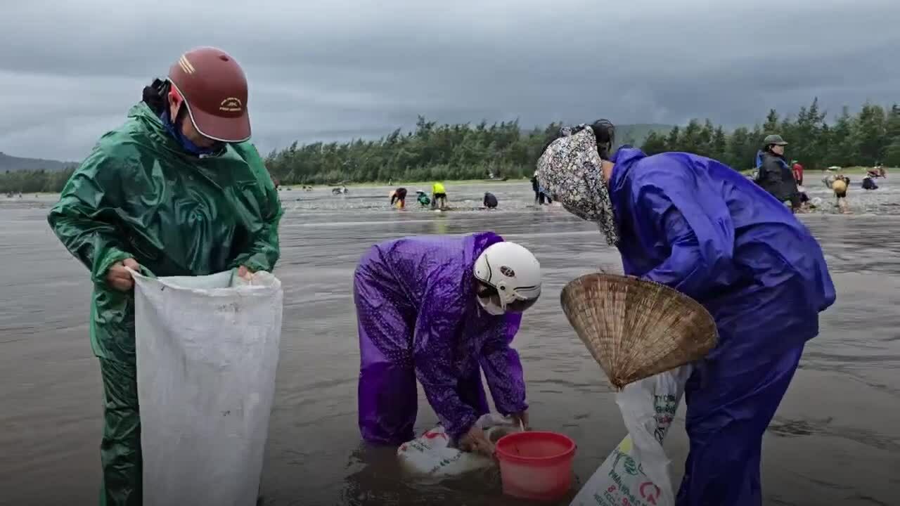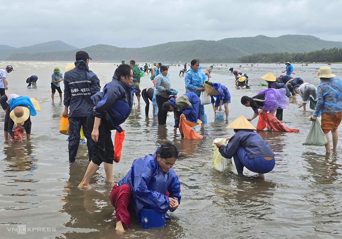 Ngồi xổm trên bờ biển,bà Nguyễn Thị Bình,53 tuổi,cứ khoảng 10 giây lại bỏ một nắm ngao vào bì tải,sau hai tiếng thu được hơn 50 kg. "Loài này sống cách bờ 3-5 hải lý,độ sâu hơn 1,5 m. Hai ngày qua ảnh hưởng của bão,địa bàn mưa lớn,biển động nên có thể ngao bị sóng đánh dạt vào",bà Bình nói.