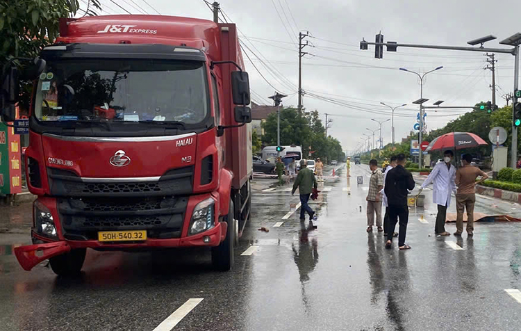 Tại hiện trường,xe máy biến dạng,văng bên lề đường. Hai ôtô tải hư hỏng phần đầu. Thời điểm tai nạn trời mưa to.