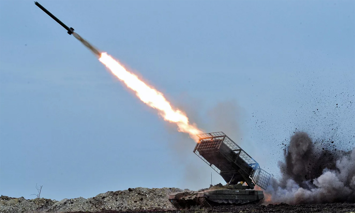 Pháo nhiệt áp TOS-1A Nga tập kích vị trí Ukraine ngày 9/4. Ảnh: BQP Nga