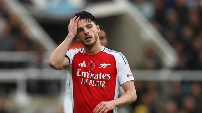 Declan Rice thất vọng sau khi Arsenal thua Newcastle 0-1 ở vòng 10 Ngoại hạng Anh trên sân St. James' Park ngày 2/11/2024. Ảnh: Reuters