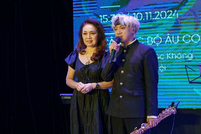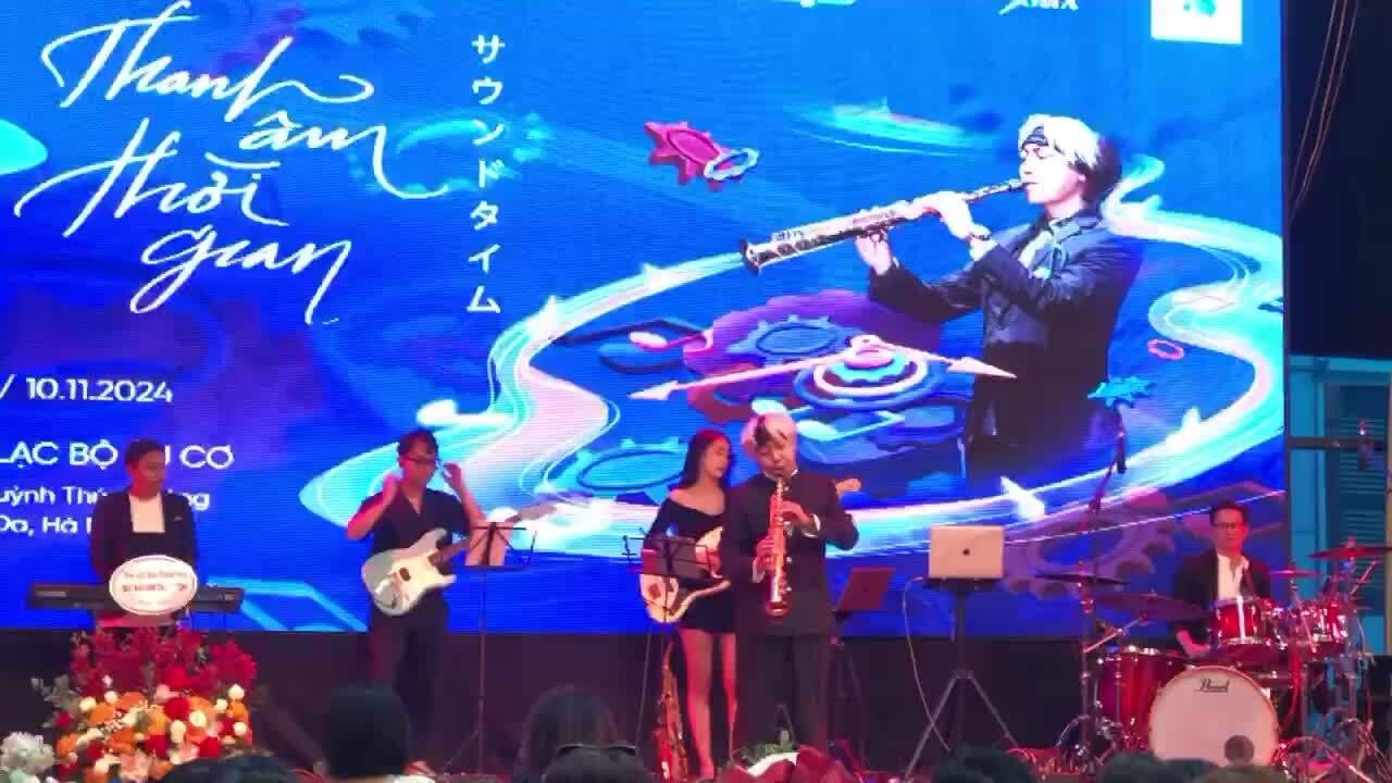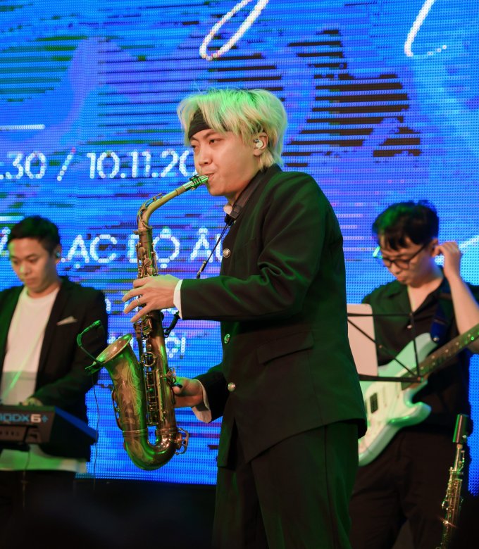 Bảo Anh Taruki diễn saxophone "Giấc mơ trưa" cùng ban nhạc ở họp báo. Video: Phương Linh