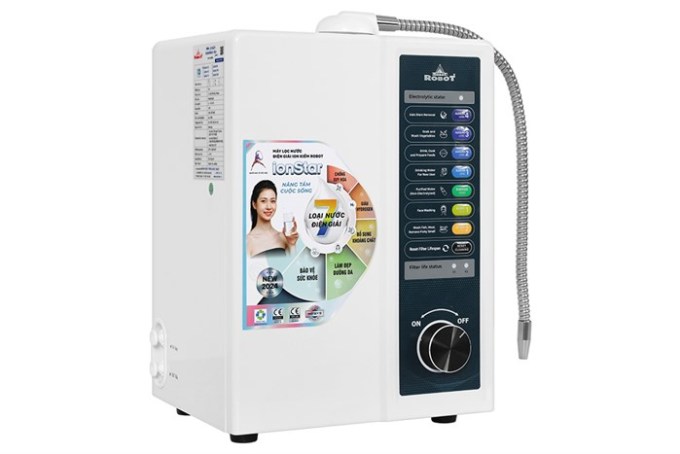 Máy lọc nước điện giải ion kiềm Robot IonStar 5X có công suất lọc 60-180 lít/giờ,trang bị 5 tấm điện cực Titanium phủ Platinum cung cấp nước ion kiềm giàu Hydrogen,mang đến 7 loại nước. Máy có thiết kế dạng để bàn với công nghệ ion kiềm UF,được sản xuất tại Việt Nam và có giá 14 triệu đồng.