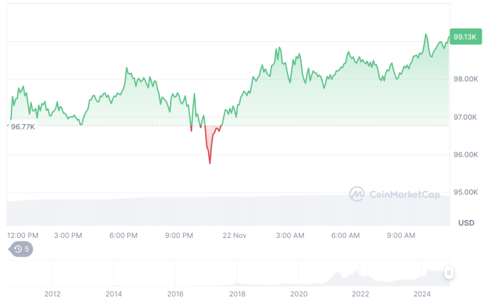Ngày 22/11,giá Bitcoin tăng mạnh lên mốc 99.000 USD,phá mọi kỷ lục trước đó. Tính riêng năm nay,tiền số này tăng 160%.