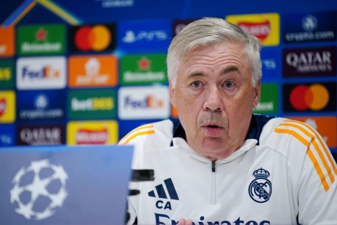 HLV Carlo Ancelotti phát biểu trong buổi họp báo trước trận Real Madrid gặp Liverpool ở lượt năm Champions League. Ảnh: PA