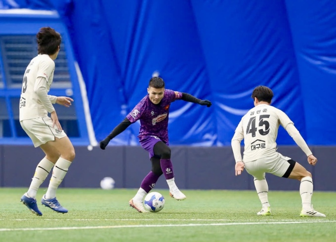 Nguyễn Quang Hải (giữa) mở tỷ số trong trận đấu tập Việt Nam thắng Daegu FC 2-0,vào trưa 29/11 tại Hàn Quốc. Ảnh: Đoàn Huynh
