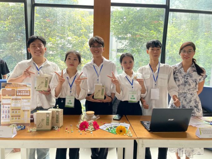 Các thành viên nhóm giới thiệu sản phẩm trà từ ruột ngô tại cuộc thi Công nghệ chế biến sau thu hoạch tổ chức tại TP HCM hôm 23/11. Ảnh: Hà An