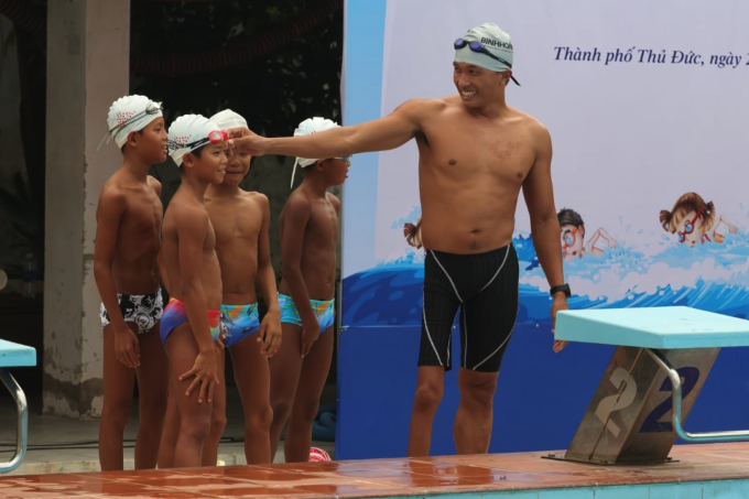 Hán Quang Thoại cùng các học trò trong một giải bơi ở TP HCM. Ảnh: NVCC