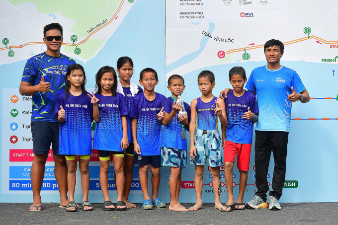 Anh Thoại (bìa phải) cùng các học trò ở Mái Ấm Thiên Thần tham gia DNSE Aquaman Việt Nam 2024. Ảnh: Aquaman Việt Nam