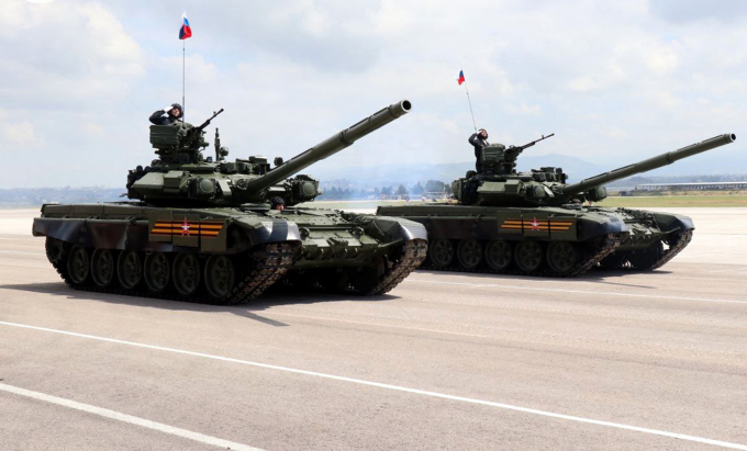 Xe tăng Nga duyệt binh kỷ niệm Ngày Chiến thắng tại căn cứ Hmeymim tháng 5/2023. Ảnh: SANA