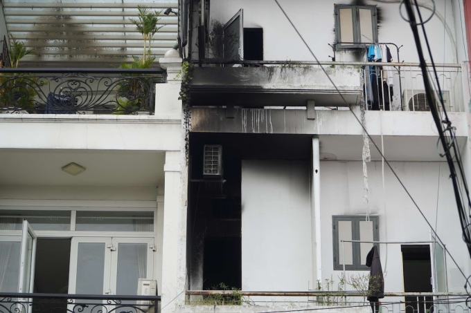 Khói đen ám trên bức tường lầu hai và ba của nhà cháy. Một số người thuê trọ đã cột dây để đu từ lầu ba xuống bên dưới để leo qua ban công nhà bên cạnh. Ảnh: Gia Minh