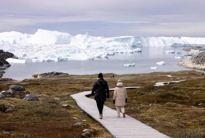 Du khách đi dạo tại Trung tâm Icefjord (Kangiata Illorsua) ở Ilulissat vào mùa hè 2022. Ảnh: AFP