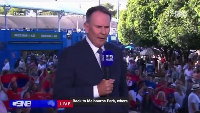 Phóng viên Tony Jones đưa tin về không khí cổ vũ của CĐV Serbia hôm 19/1. Ảnh chụp màn hình