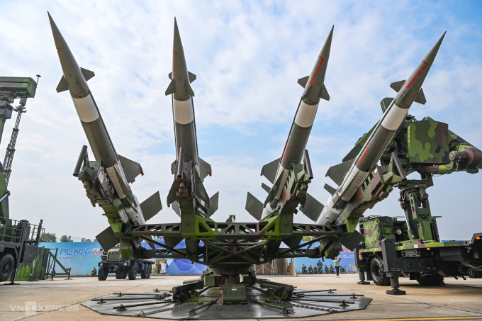 Hệ thống bệ phóng,tên lửa phòng không thuộc biên chế Quân đội Nhân dân Việt Nam tại Triển làm Quốc phòng 2024. Ảnh: Giang Huy