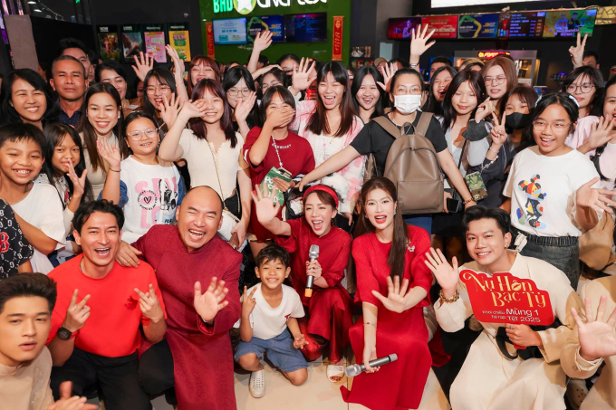 Dàn diễn viên "Nụ hôn bạc tỷ" (hàng đầu) giao lưu khán giả TP HCM dịp Tết Ất Tỵ. Ảnh: Thu Thảo