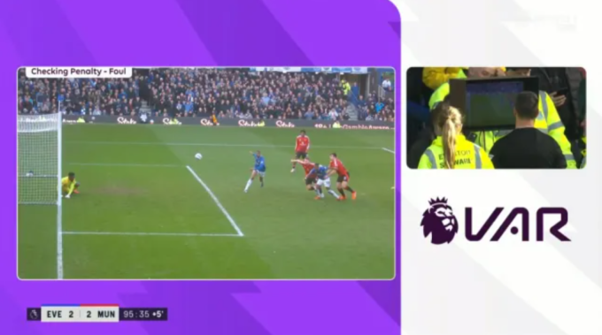 Quyết định này được trọng tài VAR Matt Donohue kiểm tra. Maguire đặt tay lên hông Young nhưng không có tác động giữ hay kéo rõ ràng nào khiến cầu thủ Everton ngã. Vì thế,VAR cho rằng việc thổi phạt đền là "quyết định sai lầm rõ ràng và hiển nhiên" và cần được thay đổi. Madley được yêu cầu ra đường biên xem lại băng hình và đã thay đổi quyết định.