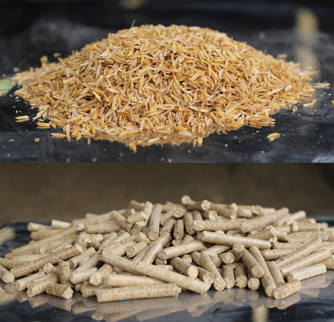 Trấu (trên) và viên nén trấu thành phẩm dùng là nhiên liệu cho lò hơi. Ảnh công ty cung cấp