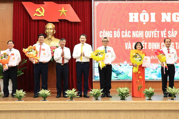 Lãnh đạo 6 sở mới thành lập nhận quyết định của UBND tỉnh Đồng Nai sáng 27/2. Ảnh: Thái Hà