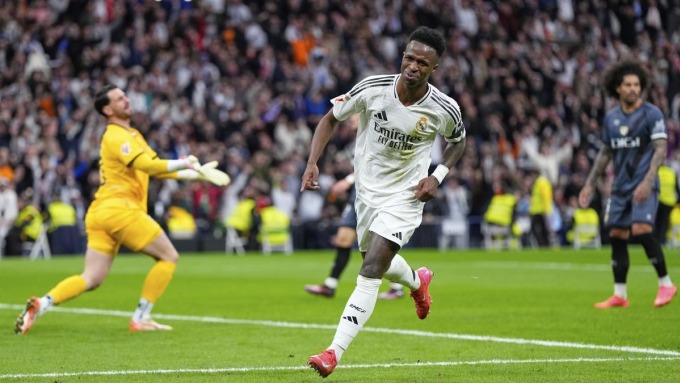 Vinicius mừng bàn trong trận Real 2-1 Rayo ở vòng 27 La Liga tối 9/3. Ảnh: AP