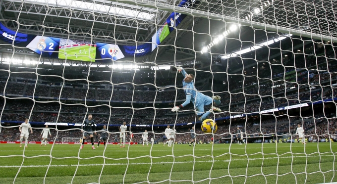 Pedro Diaz sút bóng đập xà,rơi vào bên trong vạch vôi khung thành trong trận Real 2-1 Rayo ở vòng 27 La Liga tối 9/3. Ảnh: AS