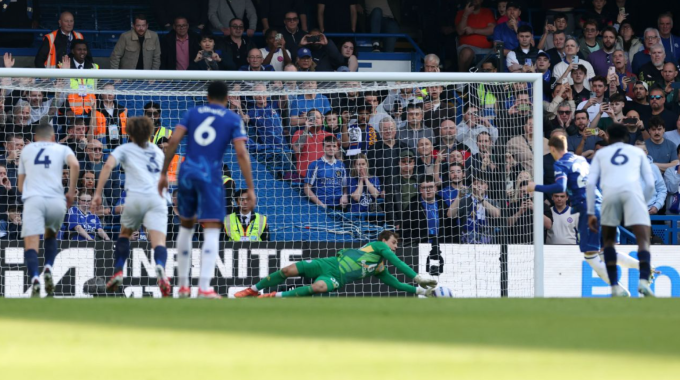 Phía đối diện,trước bàn của Cucurella,cơ hội ngon ăn nhất của Chelsea đến ở phút 19. Jadon Sancho bị Victor Kristiansen giẫm chân trong vòng cấm,mang về quả phạt đền. Trên chấm 11m,Cole Palmer sút chìm về góc phải bị thủ môn Mads Hermansen cản phá. Lần đầu tiên tiền vệ 22 tuổi đá hỏng phạt đền tại Ngoại hạng Anh,sau khi thực hiện thành công cả 12 lần trước đó.