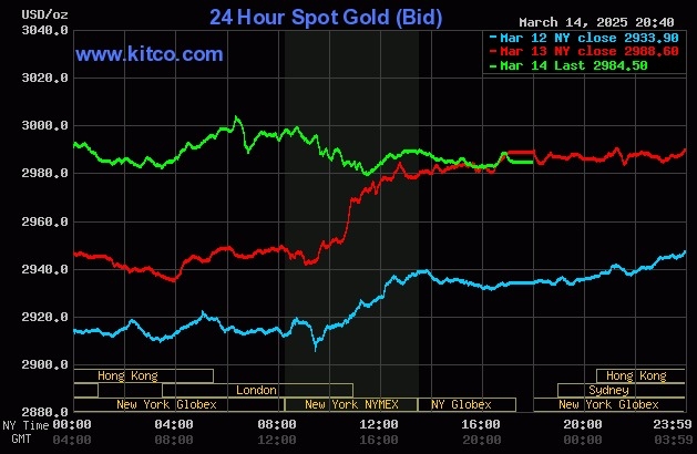 Chốt phiên giao dịch 14/3,giá vàng thế giới giao ngay giảm 4 USD về 2.984 USD một ounce. Trước đó,giá có thời điểm lập đỉnh mới tại 3.004 USD do nhu cầu trú ẩn tăng cao vì thuế nhập khẩu của Mỹ.