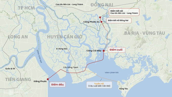 Trong đó,khu vực TP HCM dự án được nghiên cứu dài 45,5 km,bao gồm 10,5 km qua Đồng Nai. Điểm đầu tuyến kết nối với đường ven biển tỉnh Tiền Giang tại huyện Gò Công Đông,điểm cuối nối vào khu vực cảng Phước An,Đồng Nai. Mặt đường có bề rộng 8 làn xe,trong đó giai đoạn một đầu tư trước hai đường song hành,mỗi bên hai làn xe.