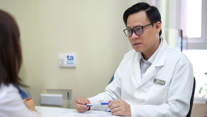 Bác sĩ Ngọc kiểm tra tình trạng sức khỏe và tư vấn hướng điều trị cho chị Loan. Ảnh: Bệnh viện Đa khoa Tâm Anh