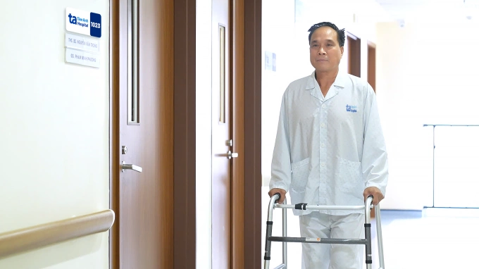 Ca phẫu thuật kéo dài một giờ,ứng dụng kỹ thuật mổ ít xâm lấn,giảm tối đa tổn thương mô mềm,ít đau sau mổ và giảm nguy cơ biến chứng. Ngay ngày đầu hậu phẫu,ông Vũ có thể tập đứng dậy và đi lại dưới sự hướng dẫn của kỹ thuật viên vật lý trị liệu. Ngày thứ 4,ông tự đi lại trong phòng,chủ động trong sinh hoạt,không cần hỗ trợ. Người bệnh bắt đầu tập phục hồi chức năng chuyên sâu với cường độ tăng dần theo chỉ định bác sĩ. Từ lúc ông nhập viện đến phẫu thuật,tập hồi phục chưa đầy một tuần.