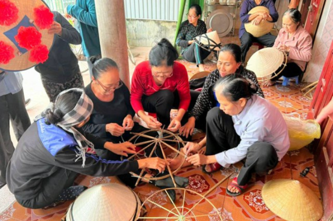 Nghệ nhân xóm Giải Tây,Bình Lục,Hà Nam đan nón lá. Ảnh: Asahi
