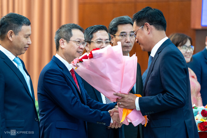 Ông Nguyễn Mạnh Hùng nhận hoa chúc mừng từ Bí thư Thành ủy Đà Nẵng Lê Ngọc Quang. Ảnh: Nguyễn Đông
