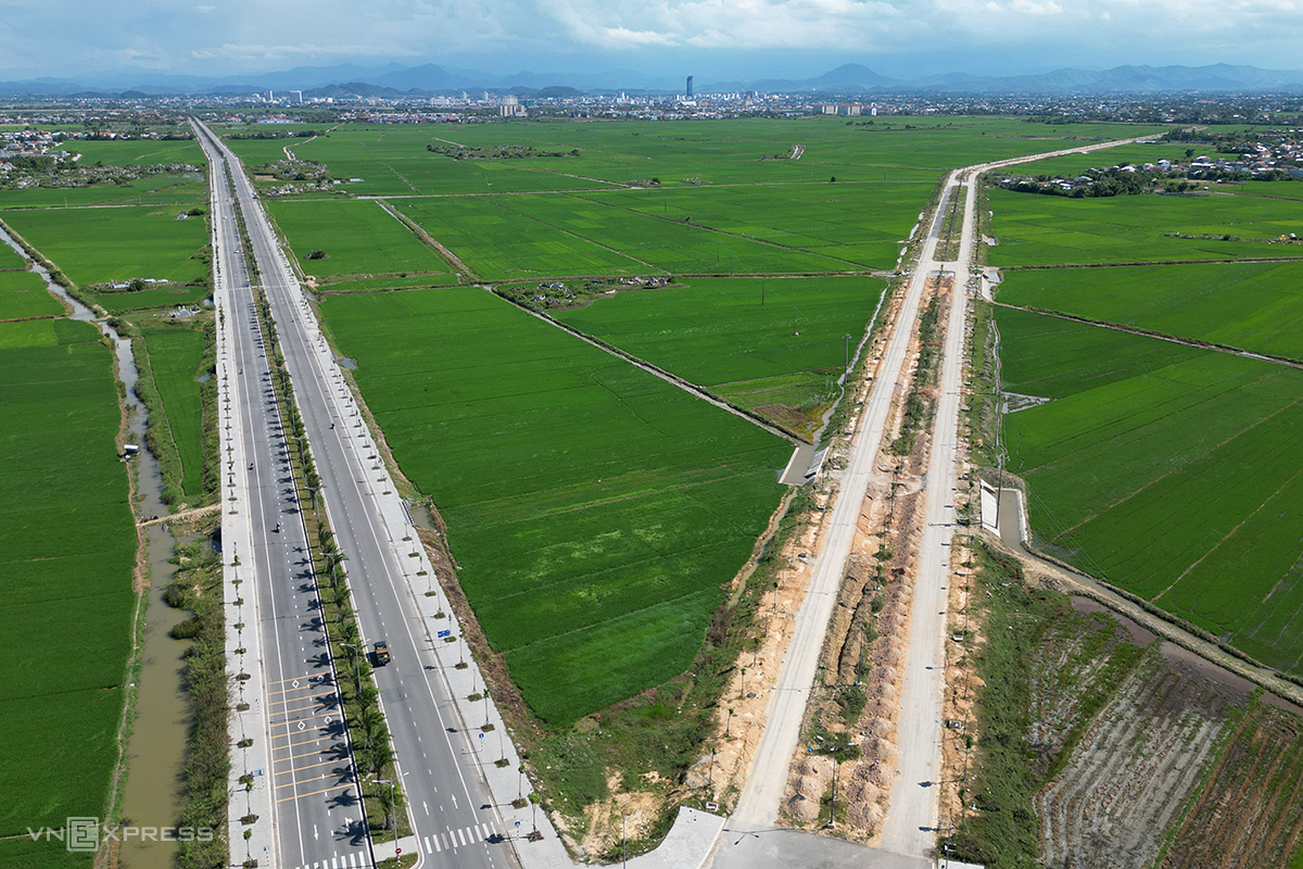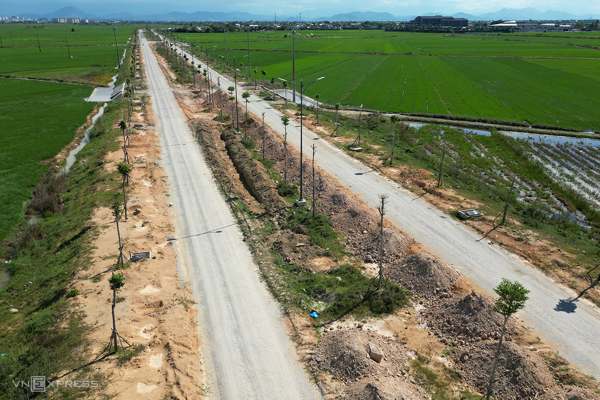 Tuyến đường Phú Mỹ - Thuận An (trái) khởi công sau nhưng đã hoàn thành trước tuyến Chợ Mai - Tân Mỹ. Ảnh: Võ Thạnh
