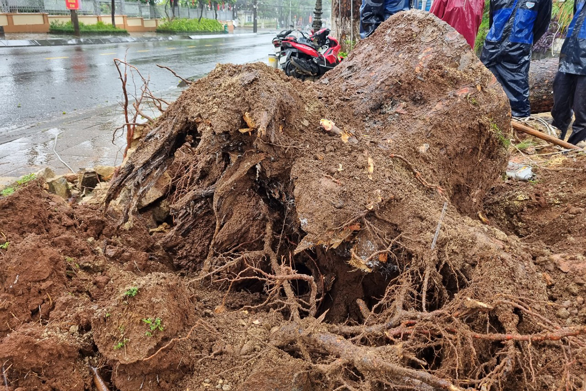 Khoảng 12h,thông cổ thụ cao trên 30 m,đường kính gốc gần một mét trên đường Quang Trung bất ngờ đổ vào quán cà phê sau trận mưa kéo dài 5-6 giờ. Thân và nhánh cây làm sập cổng tường,cửa cuốn cùng bảng hiệu.