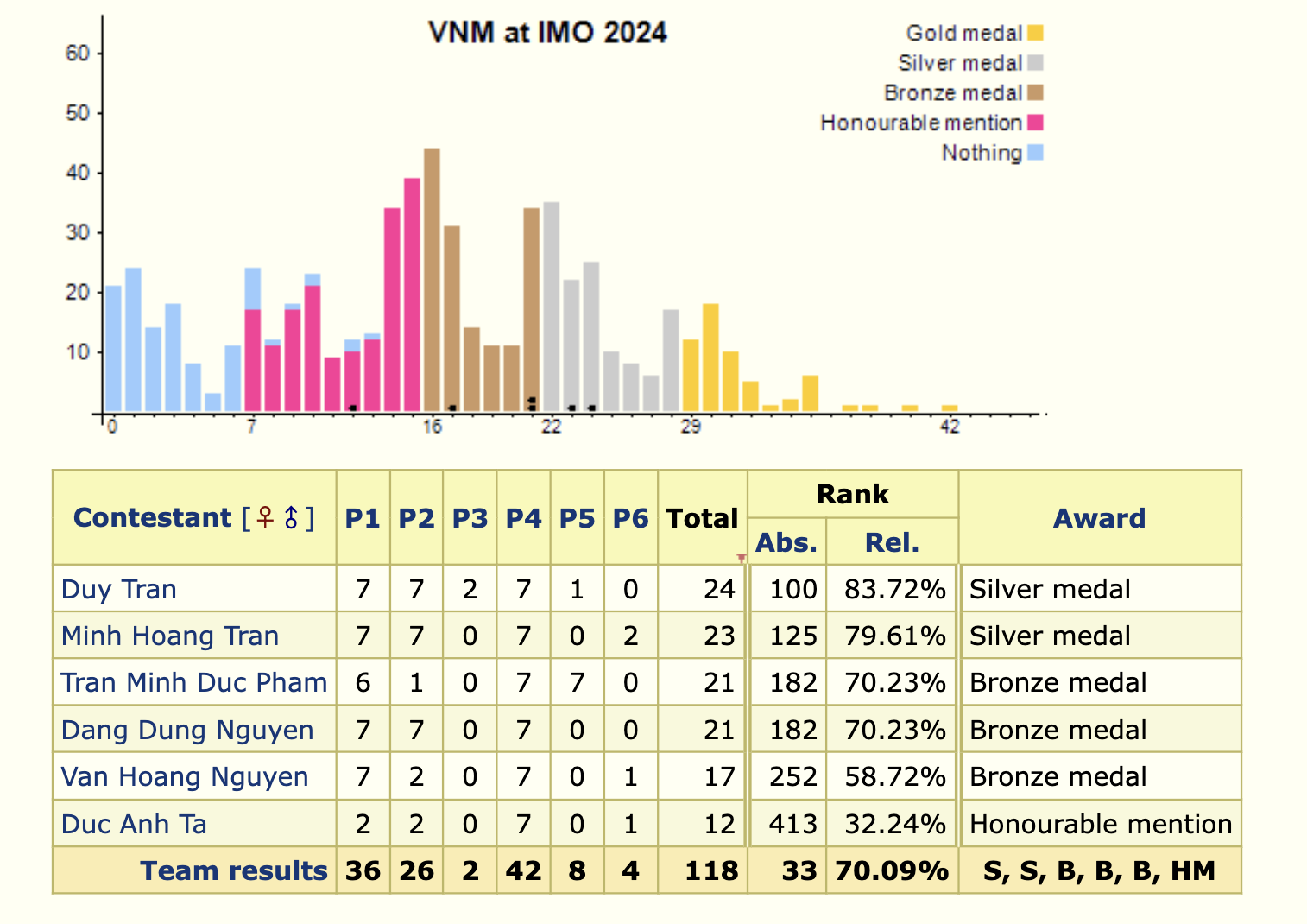 Kết quả thi IMO 2024 của 6 học sinh Việt Nam. Ảnh chụp màn hình