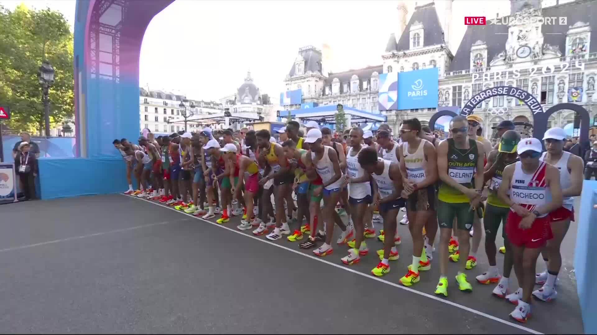 Cuộc đua marathon nam Olympic 2024 bắt đầu lúc 8h ngày 10/8 (giờ Paris). Các VĐV bám sát nhau trong khoảng 10 km đầu. Từ kilomet thứ 11,chân chạy Italy Eyob Faniel bứt lên,dẫn trước nhóm phía sau khoảng 60 m. Nắng nóng khiến các runner sớm phải nạp nước để giữ mát,nhưng đoạn dốc ở kilomet 28 mới là thử thách lớn nhất.