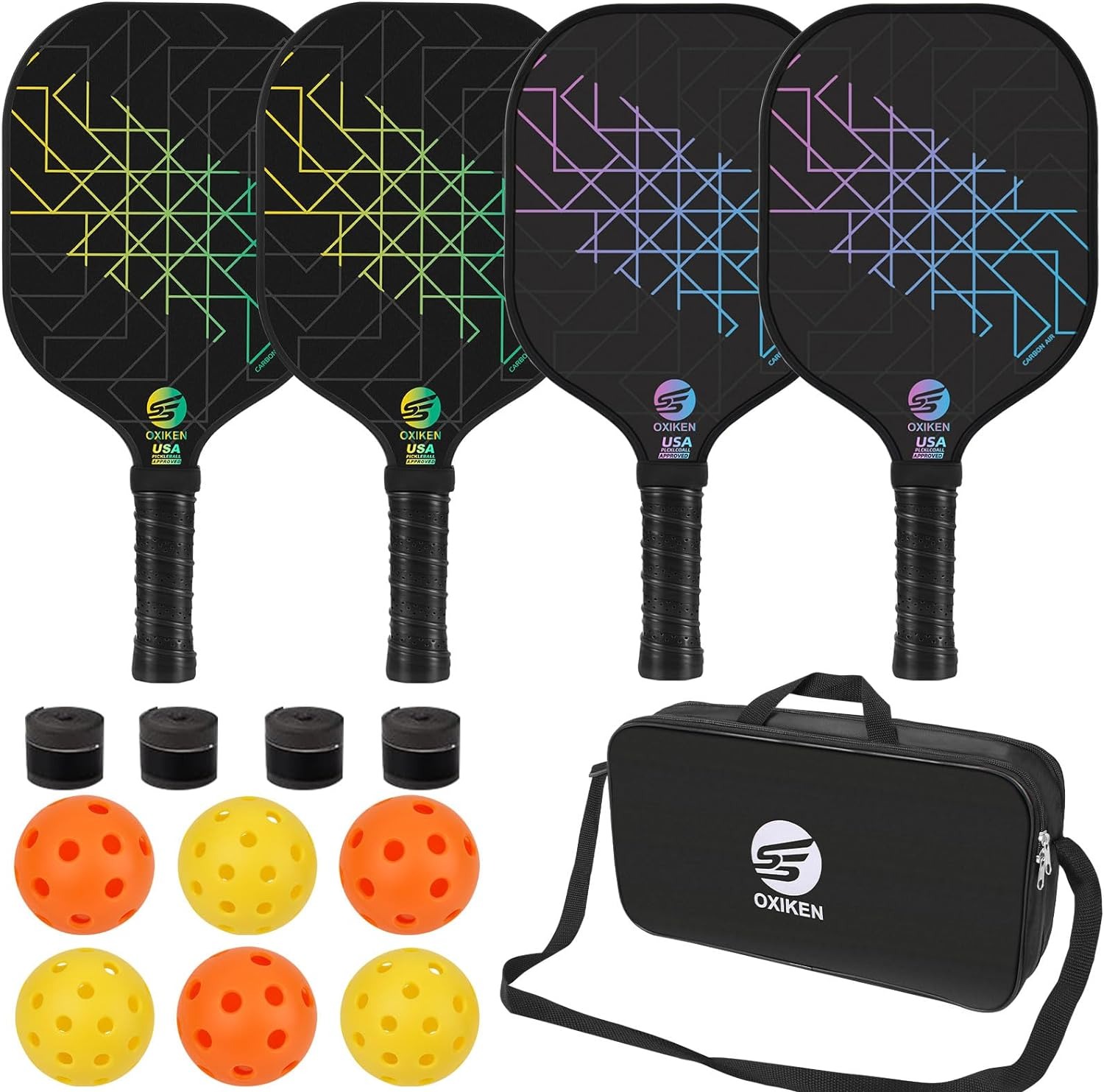 Vợt pickleball có hình dạng chữ nhật với tay cầm,nhưng kích thước lớn hơn vợt bóng bàn - dài tối đa 43,18 cm,với tổng chiều dài và chiều rộng không được vượt quá 60,96 cm. Bóng thi đấu là bóng nhựa cứng,đường kính từ 74 - 76 mm,nặng từ 22 - 26 gram,có độ nảy thấp hơn bóng nỉ trong tennis.