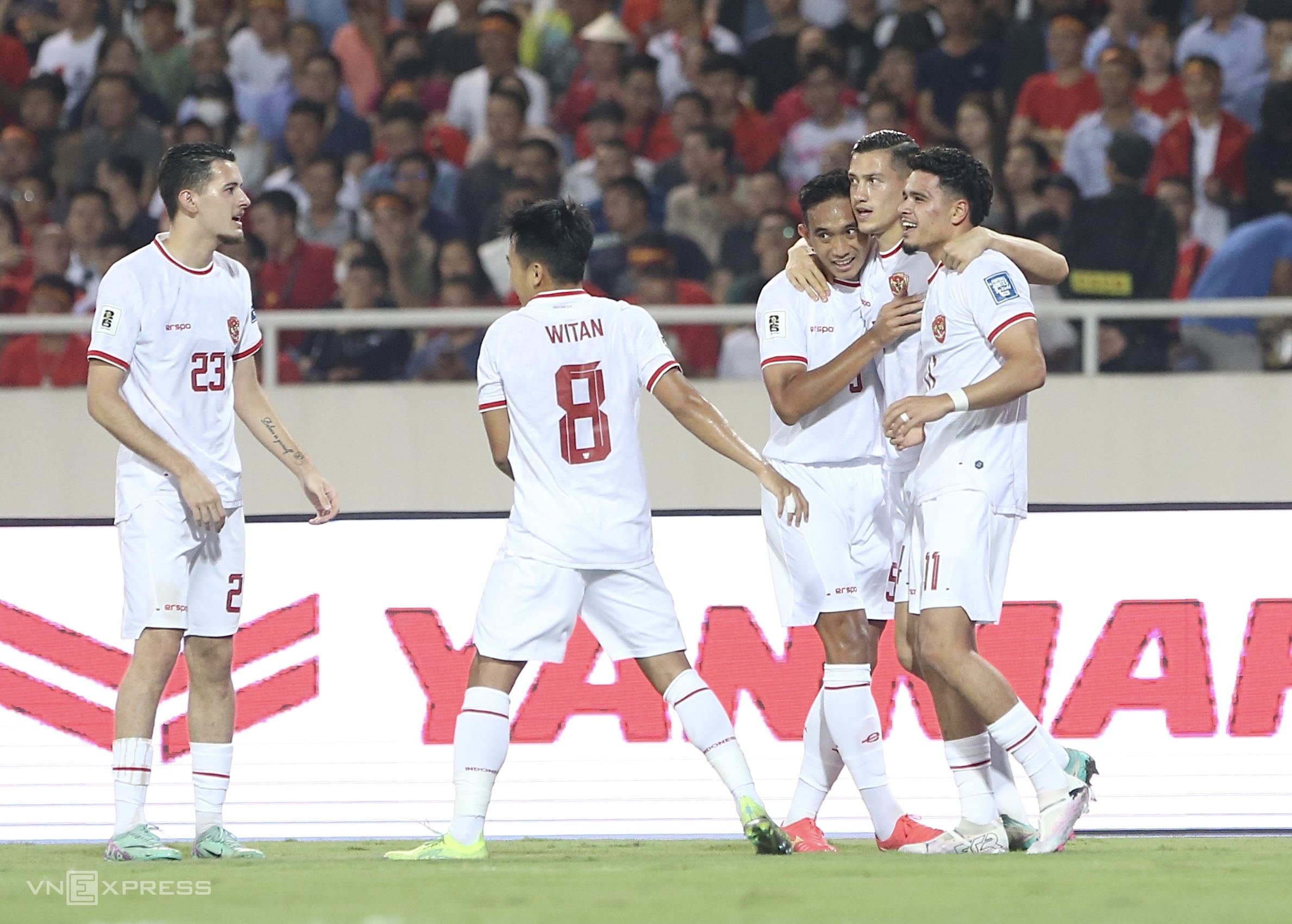Tiền đạo Ragnar Oratmagoen và trung vệ Jay Idzes (từ phải sang) ghi hai bàn cho Indonesia trong trận thắng Việt Nam 3-0,ở vòng loại hai World Cup 2026,tại sân Mỹ Đình. Ảnh: Hiếu Lương