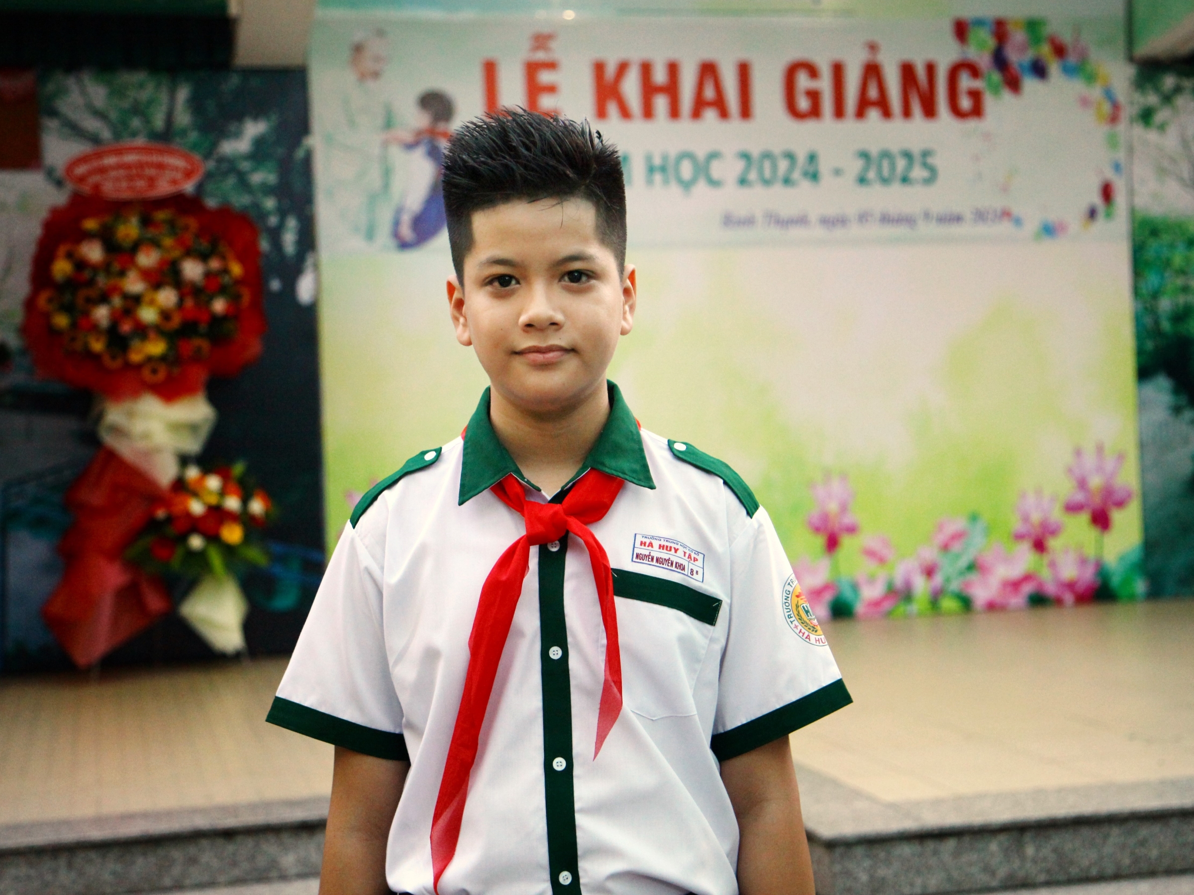 Nguyên Khoa trong lễ khai giảng ở trường THCS Hà Huy Tập,sáng 5/9. Ảnh: Gia đình cung cấp