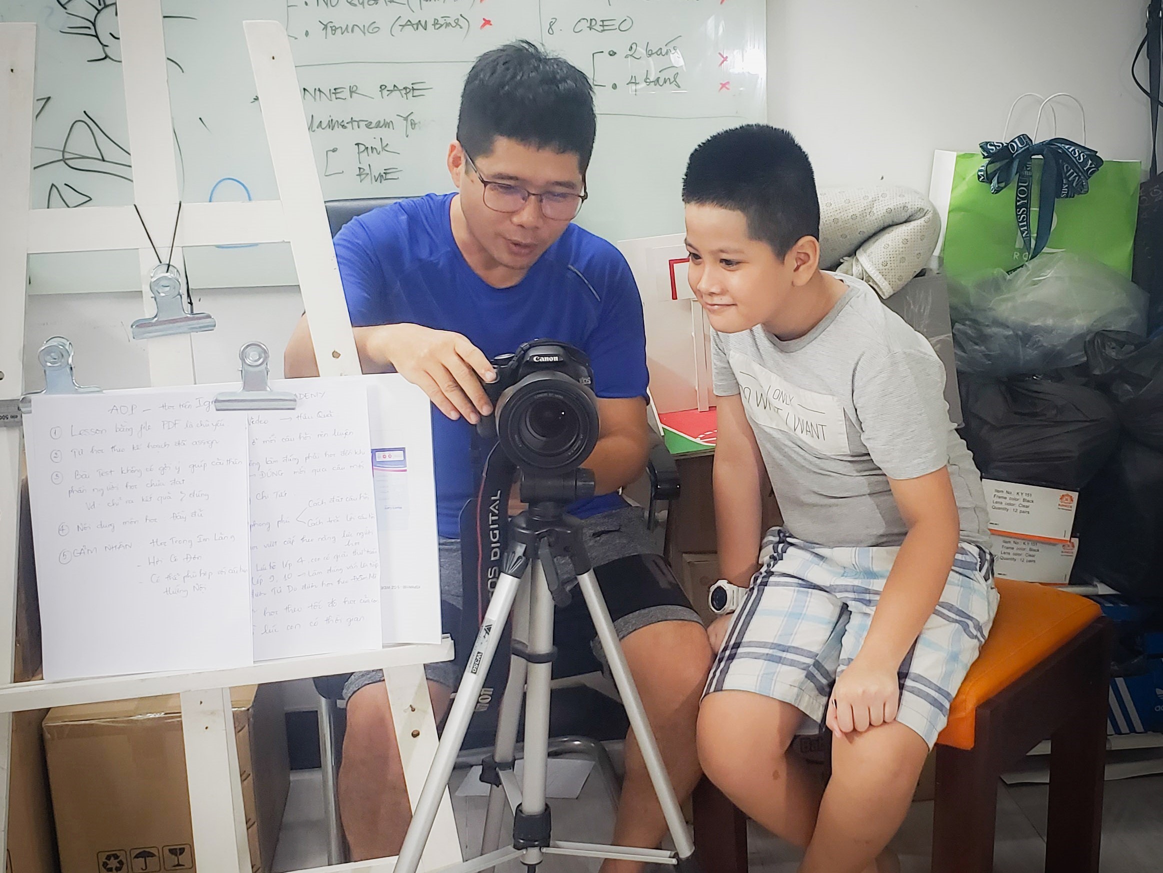 Khoa cùng bố chuẩn bị buổi dạy trực tuyến. Ảnh: Gia đình cung cấp