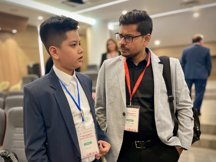 Khoa trò chuyện với đại biểu người Bangladesh trong một hội thảo quốc tế. Ảnh: Gia đình cung cấp