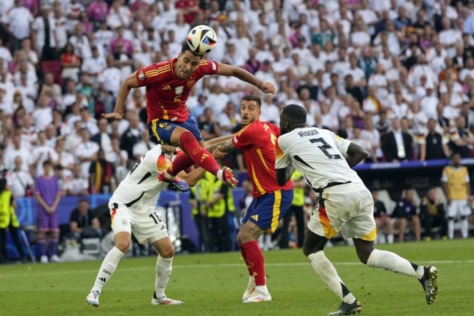 Merino đánh đầu,ghi bàn giúp Tây Ban Nha hạ Đức 2-1 trong trận tứ kết Euro 2024 trên sân Stuttgart ngày 5/7. Ảnh: AP