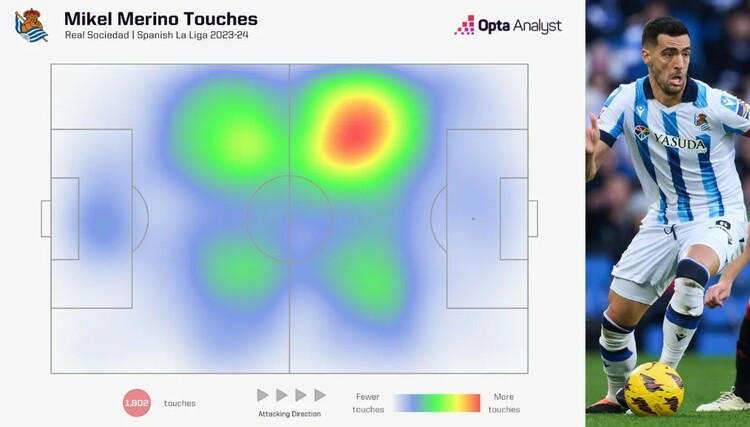 Những bản đồ nhiệt của Opta dưới đây cho thấy xu hướng thi đấu giống nhau của Merino và Rice mùa trước.