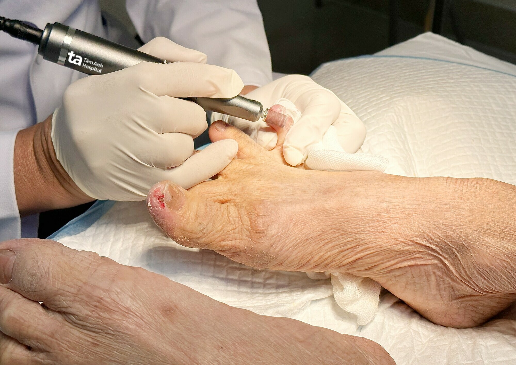 Bác sĩ mài móng chân bị dày sừng và xử lý móng quặp cho người bệnh tiểu đường. Ảnh: Bệnh viện Đa khoa Tâm Anh