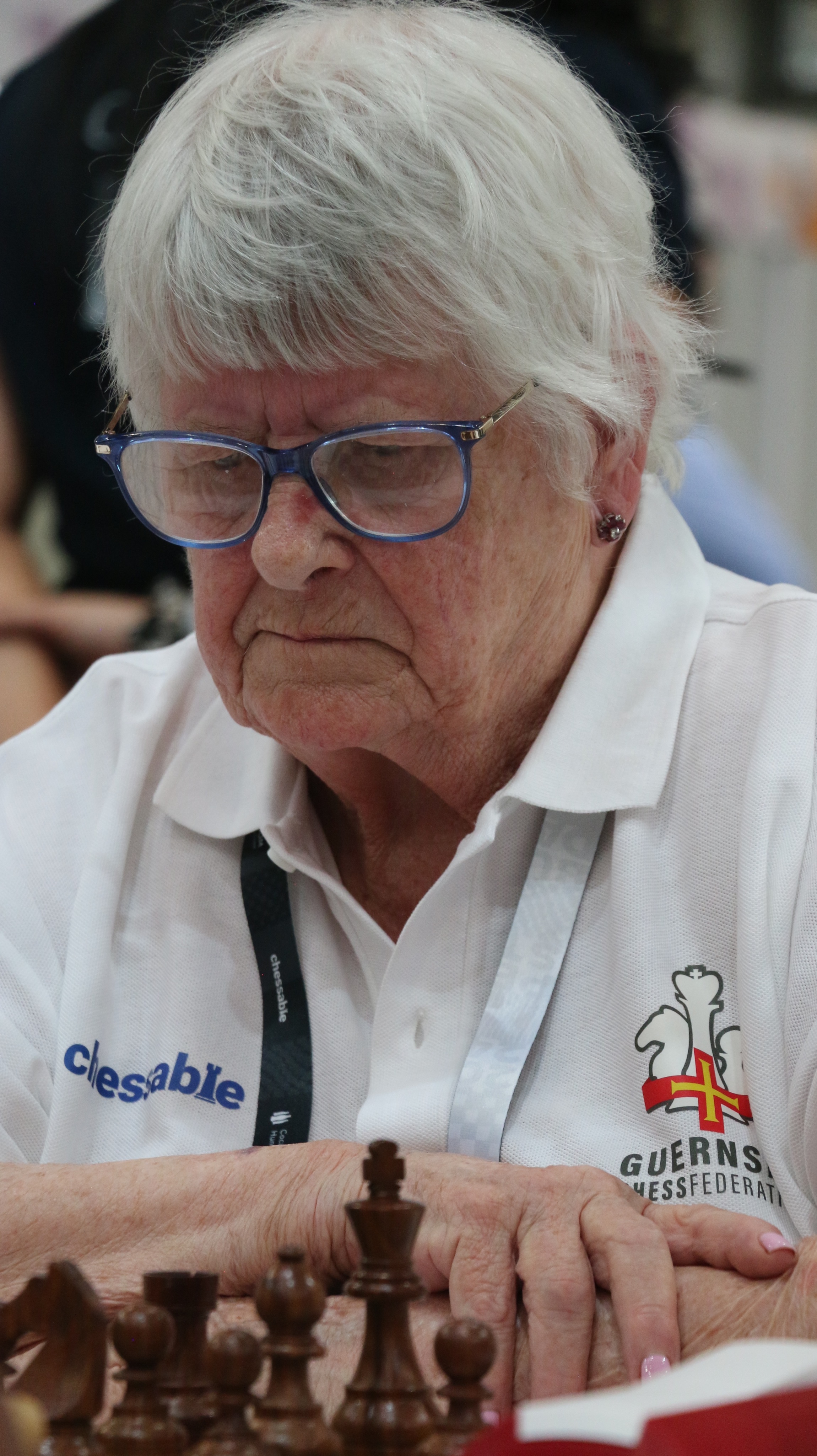 Nữ kỳ thủ 84 tuổi Pauline Woodward tại Olympiad cờ vua 2024 ở Budapest,Hungary. Ảnh: FIDE