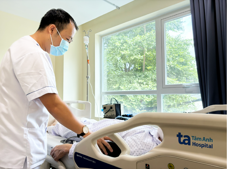 Điều dưỡng đo huyết áp và nhịp tim cho ông Mạnh sau cấp cứu đột quỵ. Ảnh: Bệnh viện Đa khoa Tâm Anh