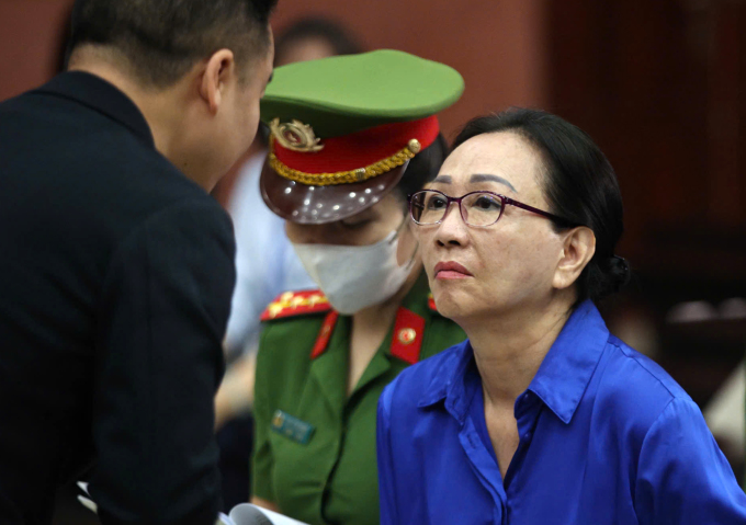 Bà Trương Mỹ Lan trao đổi với luật sư trước phiên tòa hôm nay. Ảnh: Quỳnh Trần