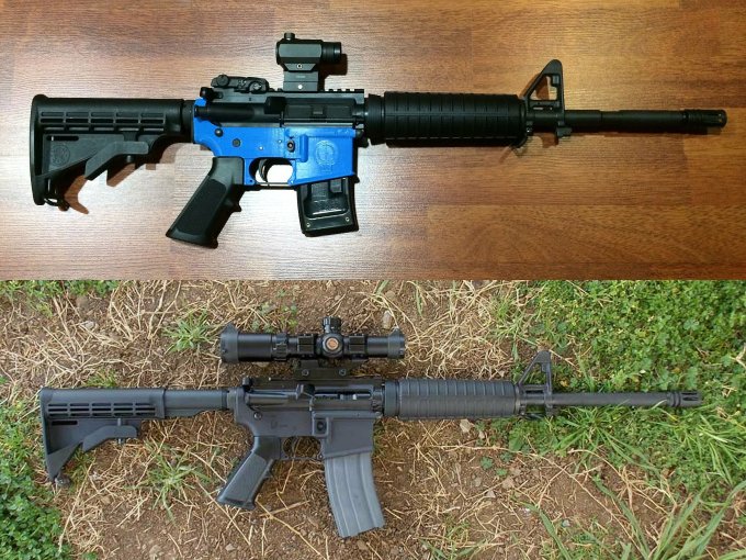 Một khẩu súng trường kiểu AR-15 (bên dưới) và khẩu súng tương tự sử dụng hộp khóa nòng màu xanh in bằng công nghệ 3D. Ảnh: X/EdMarkey