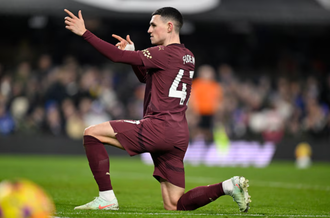 Phil Foden mừng bàn thứ ba của Man City. Ảnh: Reuters