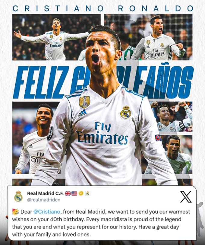 Real là CLB đầu tiên gửi lời chúc mừng sinh nhật tới Ronaldo trên mạng xã hội.
