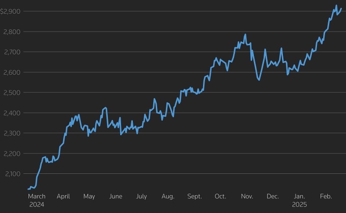 Từ đầu năm,giá kim loại quý đã tăng 12%. Ngân hàng Goldman Sachs mới đây nâng dự báo giá vàng thế giới cuối năm nay lên 3.100 USD một ounce,tăng so với mức 2.890 USD trước đó. Nếu bất ổn chính sách vẫn ở mức cao,đặc biệt là lo ngại về thuế nhập khẩu của Mỹ,ngân hàng này cho rằng vàng có thể lên 3.300 USD.